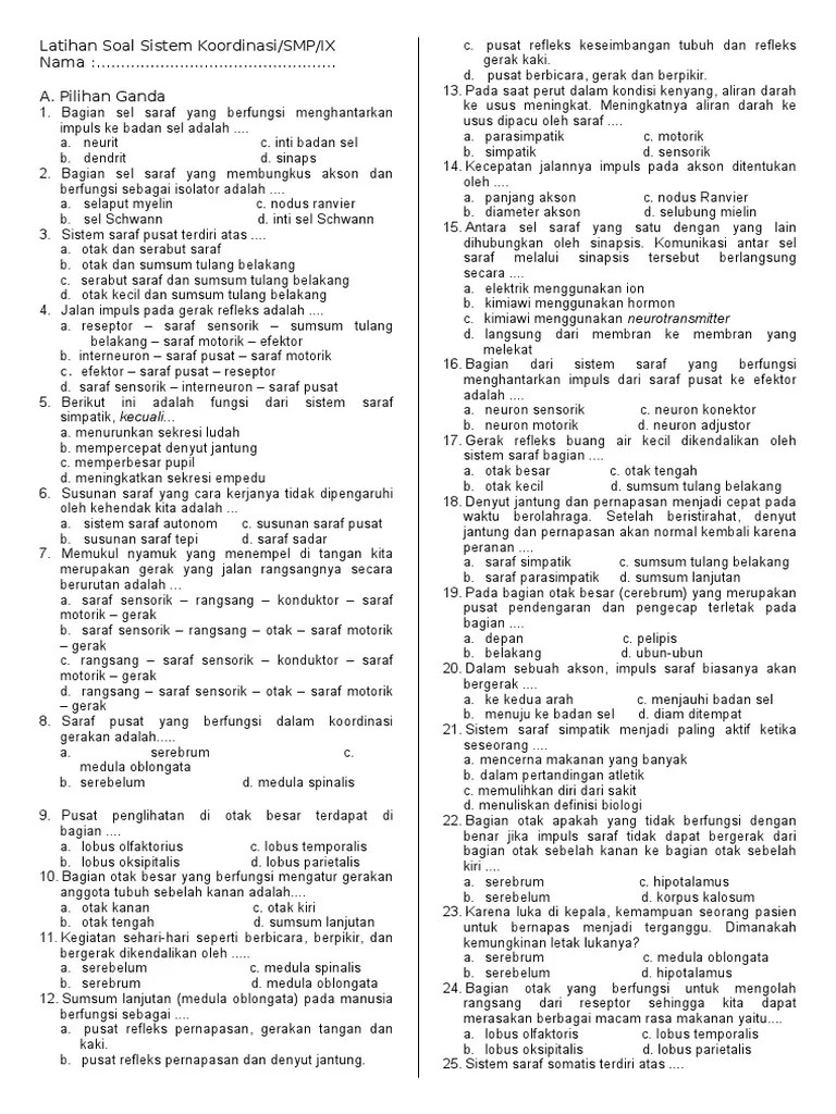 Hormone dan alat indera) dalam kaitannya dengan mekanisme koordinasi dan. Soal dan jawaban sistem indera khusus contoh soal sistem saraf alat. Jambi untuk soal nomor 1 sampai 3 perhatikan gambar neuron . System koordinasi pada manusia dan hewan perbedaan. Rekapitulasi soal yang dipakai dan soal yang dibuang untuk evaluasi pada materi pembelajaran sistem.